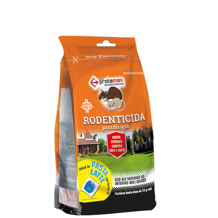 Caratteristiche: un’esca rodenticida pronta all’uso in pasta. È ideale per il controllo d’infestazioni da topo domestico (Mus musculus) e ratto grigio (Rattus norvegicus). L’esca è caratterizzata da una miscela ben bilanciata d’ingredienti di origine alimentare molto appetibili per le specie di roditori sopraindicate