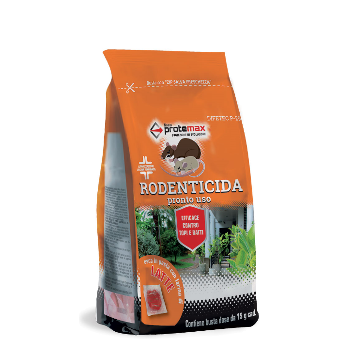 Caratteristiche: È un’esca rodenticida pronta all’uso in pasta. È ideale per il controllo d’infestazioni da topo domestico (Mus musculus) e ratto grigio (Rattus norvegicus). L’esca contiene Difenacoum, principio attivo anticoagulante di 2° generazione, è caratterizzato da una miscela ben bilanciata d’ingredienti di origine alimentare molto appetibili per le specie di roditori sopraindicate.